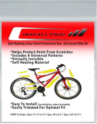 Our Clear Paint Protection Film-Universal Bicycle Kit is a very durable, self-healing, 8 millimeter thick clear coated urethane film that helps preserve your Bicycle’s finish. It helps protect against rock chips, abrasion and weathering. It is virtually invisible and clear-coated to help make it resistant to yellowing and staining. Once applied, no special care is required. After installation, wait 24 hours before washing your bike. Installation is easy, and we provide detailed installation videos to help make installation even easier.